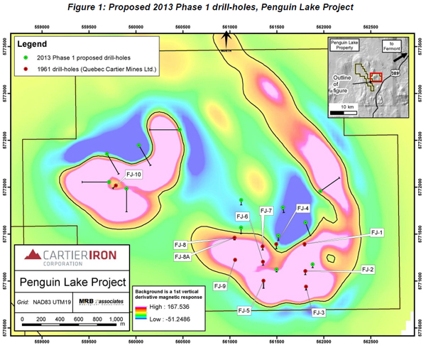 A preliminary exploration campaign was carried out in 1961 by Quebec Cartier Mining Co. (“QCM”) in the area of Cartier Iron’s proposed 2013 campaign. QCM’s geological mapping and geophysical surveys outlined two distinct, strong, positive magnetic-response anomalies east of Penguin Lake that they subsequently tested with a ten-hole diamond-drilling program. The historic drill-holes intersected high-grade hematite- and magnetite-rich iron formation up to 150 metres thick, from surface to depths of approximately 200 metres, coincident with the magnetic-response anomalies. This zone of mineralization has been catalogued by Ressources naturelles Québec as the Lac Pingouin occurrence (http://sigeom.mrnf.gouv.qc.ca/ Cogite # 23C/01-0004).
